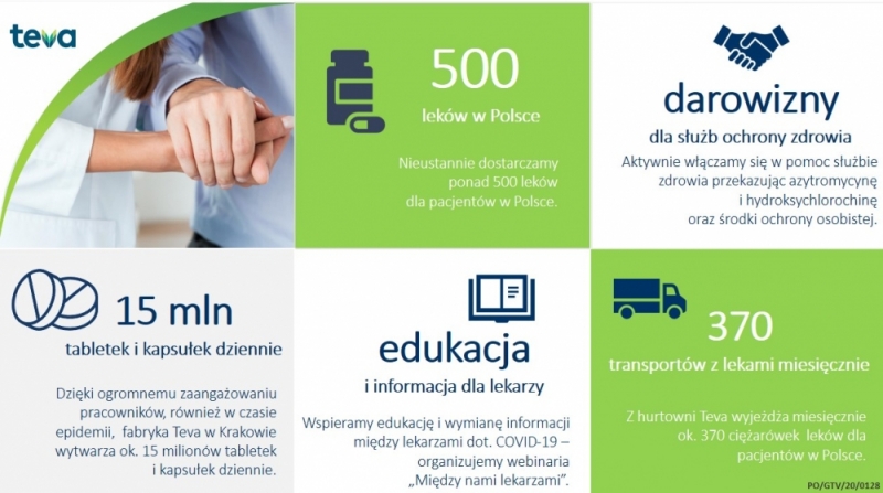 Teva w Polsce ogłosiła przekazanie w formie darowizny dwóch leków, które są przedmiotem obserwacji przez międzynarodowe środowisko lekarskie pod kątem skuteczności leczenia zakażeń COVID-19 na świecie: azytromycyny oraz hydroksychlorochiny. Darowizna dotyczy 5000 opakowań leku zawierającego substancję czynną azytromycynę oraz 270 opakowań leku zawierającego substancję czynną hydroksychlorochinę, które zostaną przekazane do dyspozycji Centralnej Bazy Rezerw Sanitarno-Przeciwepidemicznych z przeznaczeniem dla polskich szpitali.
