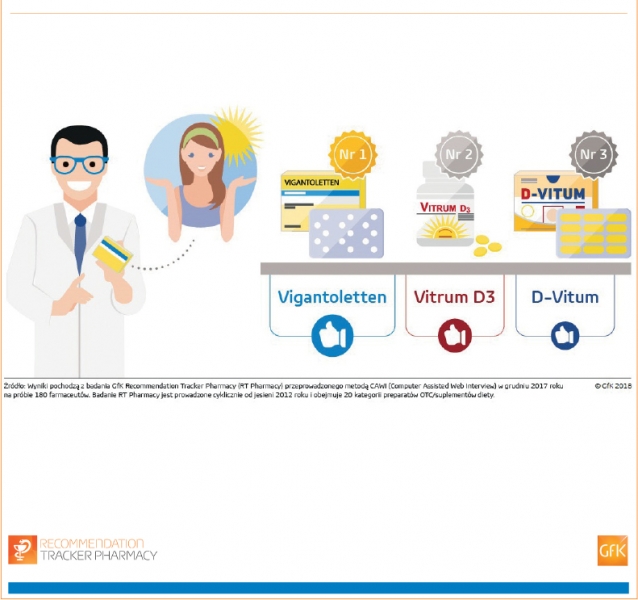 W sezonie zimowym farmaceuci udzielali średnio 21 rekomendacji preparatów zawierających witaminę D w ciągu typowego tygodnia. Podobnie jak w ubiegłym sezonie, marką najczęściej przez nich polecaną był Vigantoletten firmy Merck, który uzyskał istotną przewagę nad kolejnymi w rankingu preparatami: Vitrum D3 firmy Takeda oraz D-Vitum promowany przez Oleofarm.